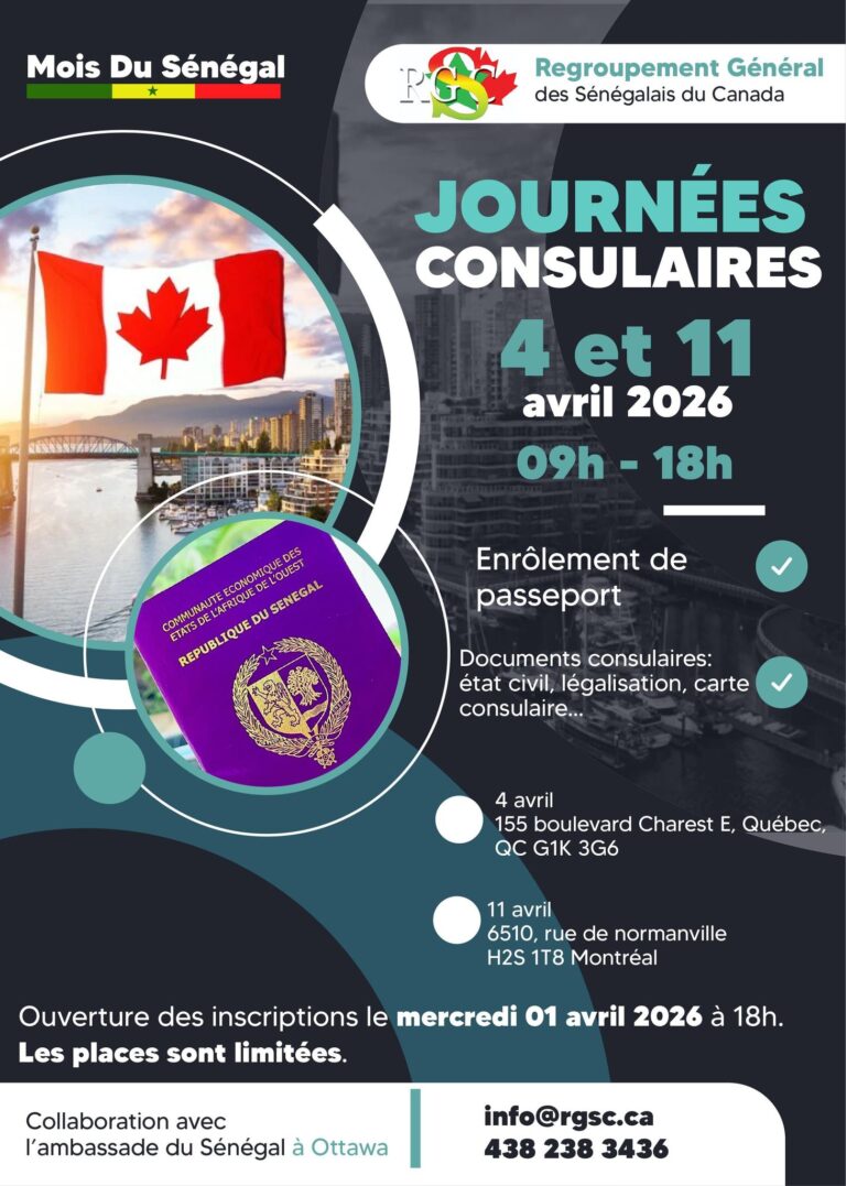 Le Regroupement Général des Sénégalais du Canada (RGSC) regroupe l’ensemble de la communauté sénégalaise résidant au Canada, qu’ils soient immigrants, étudiants, ou visiteurs, toutes les associations sectorielles, partiellement ou entièrement sénégalaises ainsi que toutes les associations et individualités amies du Sénégal.